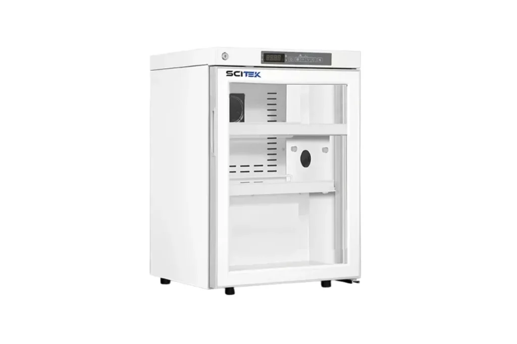 - Safe for storing samples at temperatures from 2° to 8°C, the laboratory refrigerator features adjustable temperature control and automatic defrost.